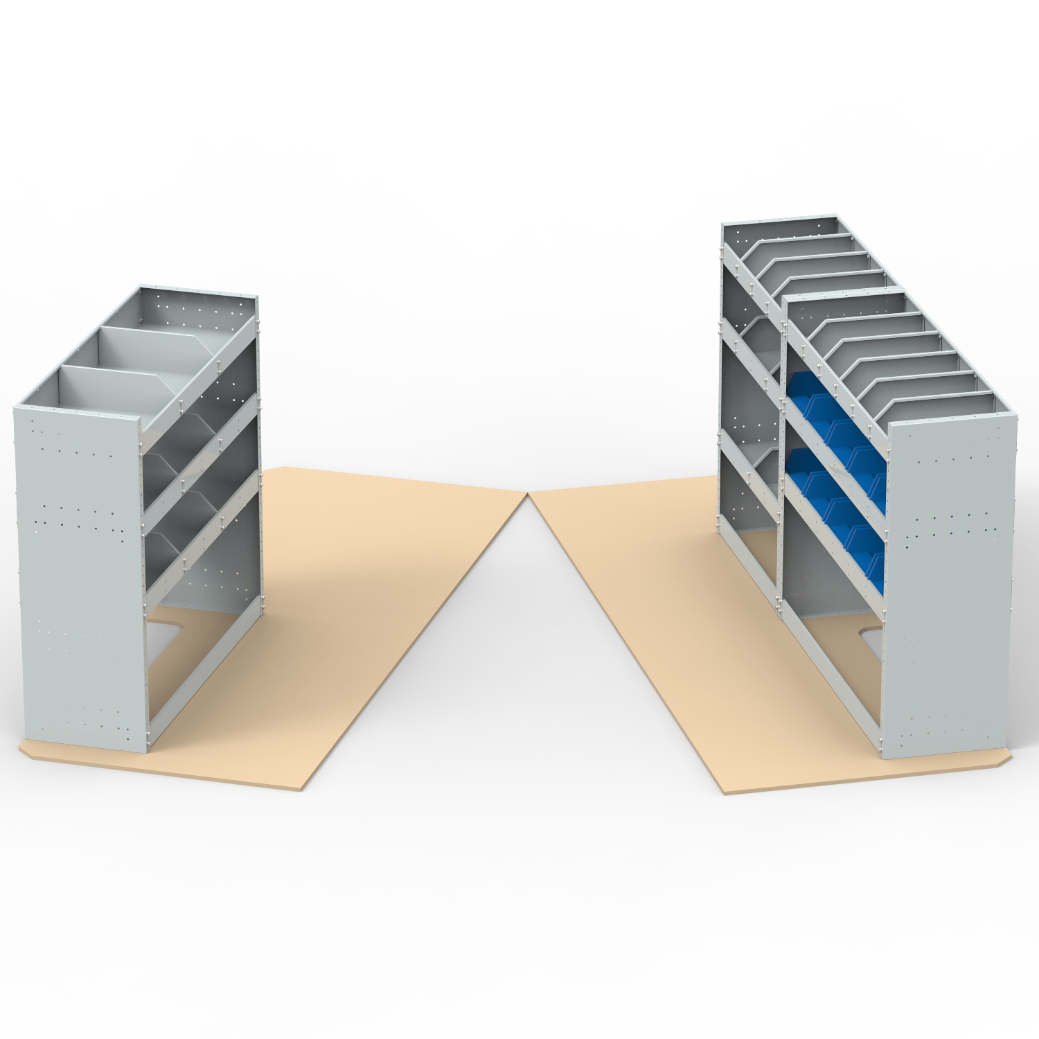 VAN STEEL SHELVING UNIT Universal Van Racking system. COMPLETE VAN STORAGE SOLUTION designed to fit the drivers side of panel vans This unit combination has been designed to fit across the drivers side (SBR1, SBR2) and passenger side (SBR3) of most panel vans. This package consists of 3 separate, joinable units (SBR1 x1 SBR2 x1 SBR3 x1) that can be placed together or on opposite sides of the van. Combined together, SBR1 and SBR2 measure 1740mm wide x 360mm deep x 1000mm high, Units each include 3 adjustable shelves which can be moved up and down the unit to create a space suited to your needs. Includes 12 dividers which can be re-positioned or removed. Includes 10 blue plastic bins – 200x360x130mm Unit dimensions: