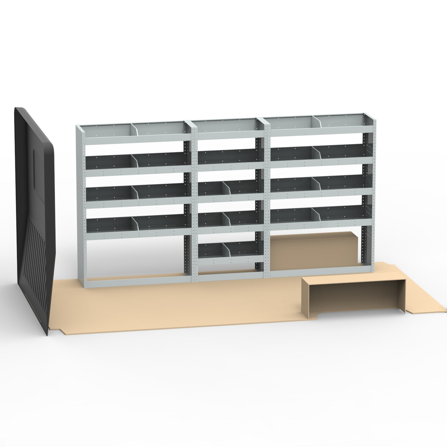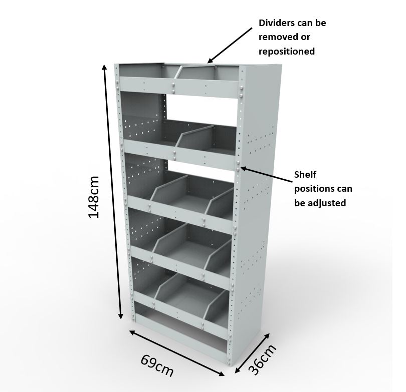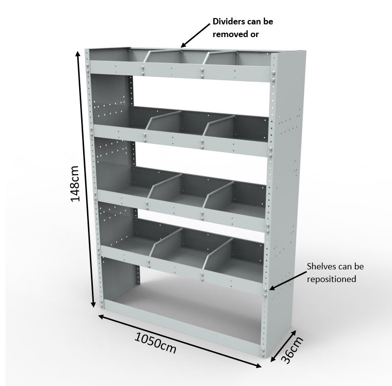 VAN STEEL SHELVING UNIT Universal Van Racking system. COMPLETE VAN STORAGE SOLUTION. Van Racking system designed to fit the driver’s side of panel vans This unit combination has been designed to fit across the driver’s side of most panel vans. This package consists of 3 separate, joinable units (HS1 x1 HS5 x2.) Combined together, HS1 and HS5 x2 measure 2790mm wide x 360mm deep x 1480mm high. Includes 13 adjustable shelves which can be moved up and down the unit to create a space suited to your needs. Includes 8 dividers which can be re-positioned or removed. Unit dimensions: