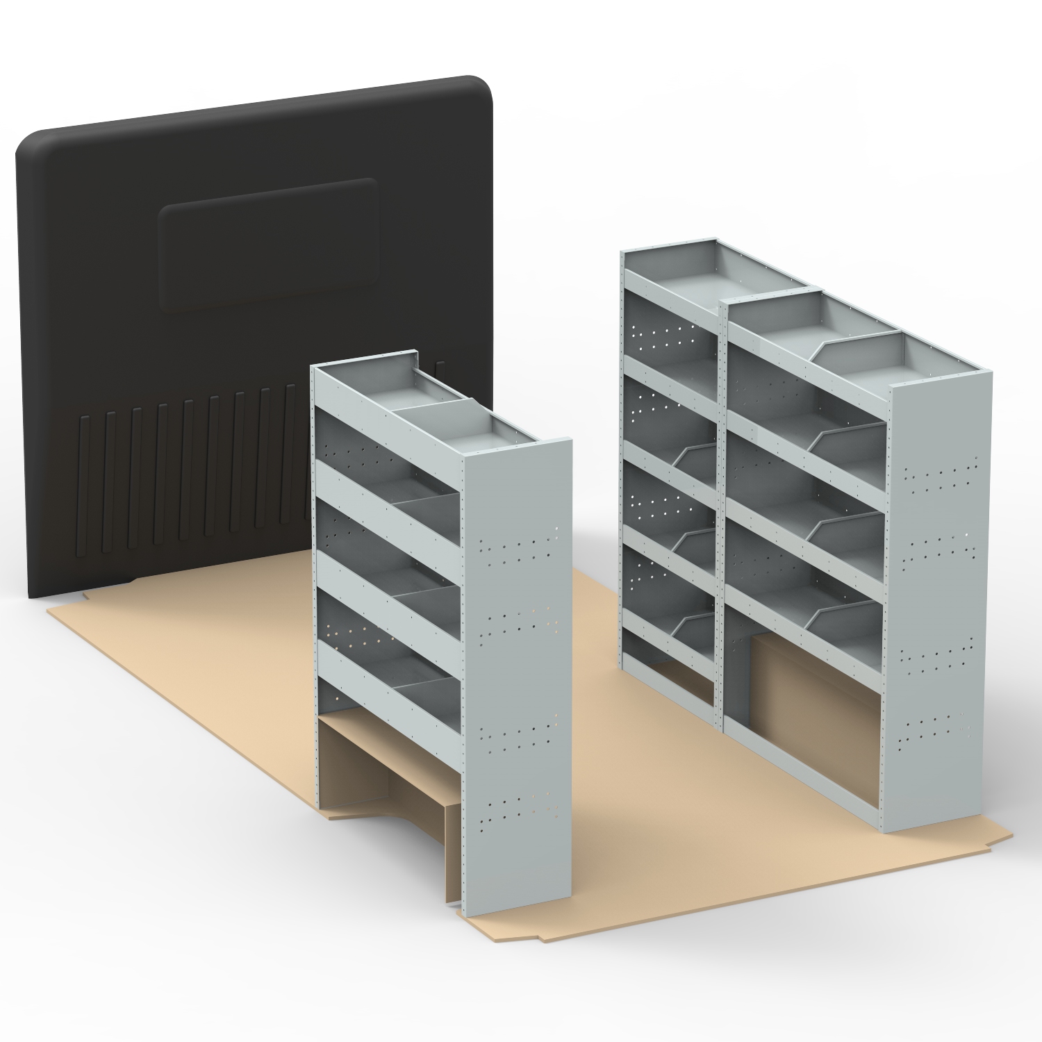 VAN STEEL SHELVING UNIT Universal Van Racking system. COMPLETE VAN STORAGE SOLUTION. Van Racking system designed to fit the driver’s side of panel vans. This unit combination has been designed to fit across the driver’s side of most panel vans. This package consists of 3 separate, joinable units (HS1 x1 HS5 x2.) Combined together, HS1 and HS5 x2 measure 2790mm wide x 360mm deep x 1480mm high. Includes 13 adjustable shelves which can be moved up and down the unit to create a space suited to your needs. Includes 8 dividers which can be re-positioned or removed. Unit dimensions: