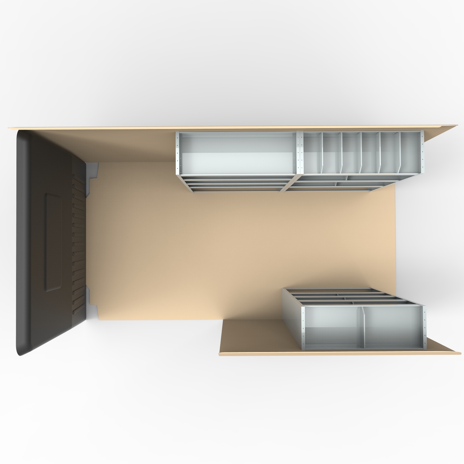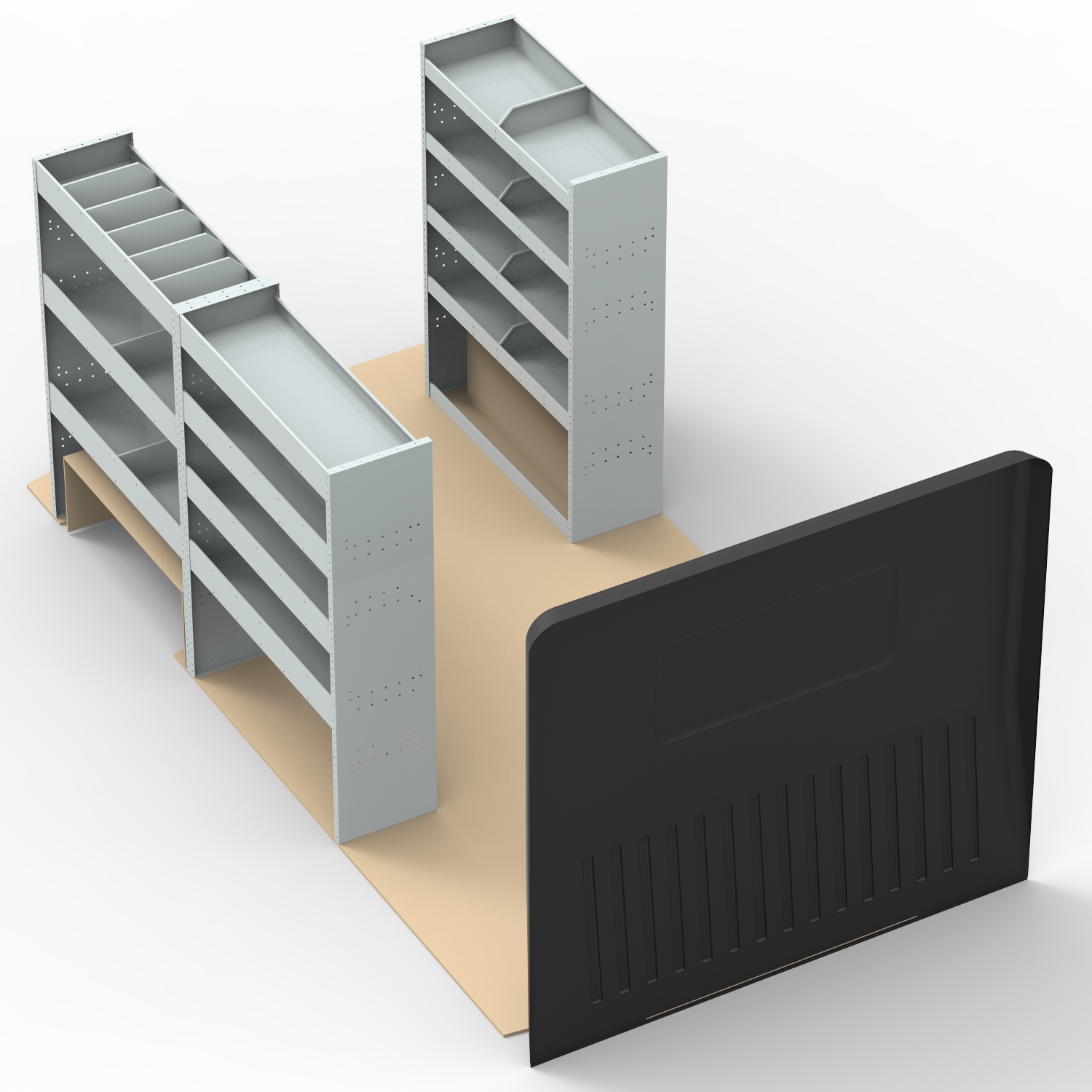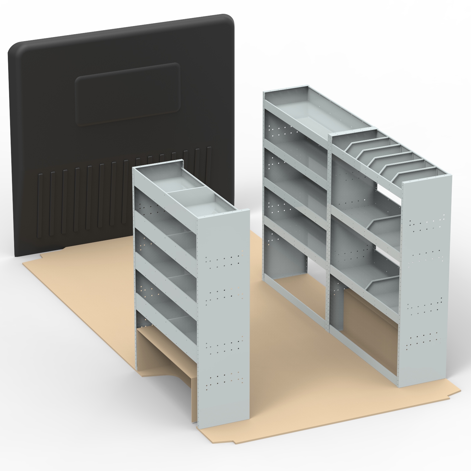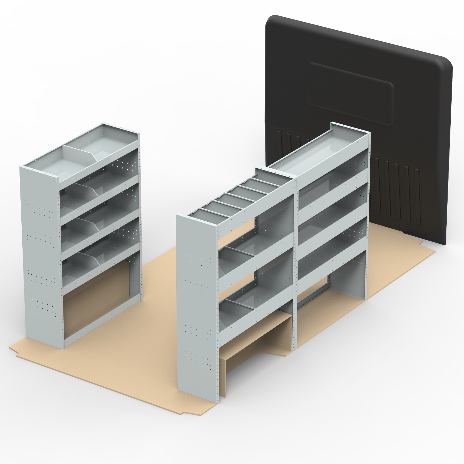 VAN STEEL SHELVING UNIT Universal Van Racking system. COMPLETE VAN STORAGE SOLUTION. This unit combination has been designed to fit along the driver’s side (HS13, HS5) and passenger side (HS5) of panel vans. This package consists of 3 separate, joinable units (HS13 x1 and HS5 x 2) which combined together, measure 3150mm wide x 360mm deep x 1480mm high. Includes 11 adjustable shelves which can be moved up and down the unit to create a space suited to your needs. Includes 24 dividers which can be re-positioned or removed. Unit dimensions: