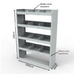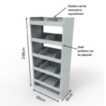 • RACK HS5 – 1050mm wide x 360mm deep x 1480mm high (contains 4 shelves and 8 dividers) Shelves are adjustable along 30mm centres. Dividers can be repositioned and removed.