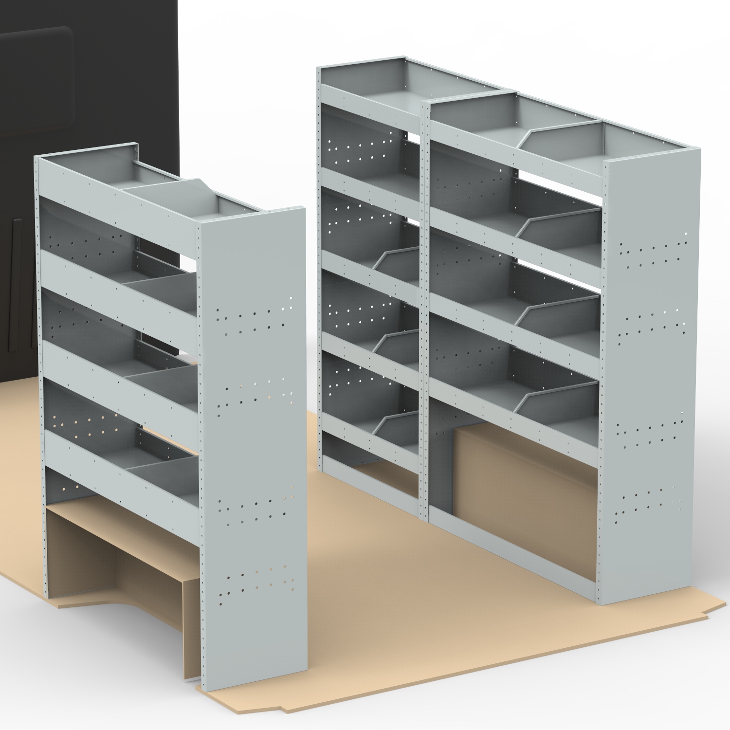 VAN STEEL SHELVING UNIT Universal Van Racking system. COMPLETE VAN STORAGE SOLUTION. This unit combination has been designed to fit across the driver’s side (HS1, HS5) and passenger side (HS5) of most panel vans. This package consists of 3 separate, joinable units (HS1 x1 HS5 x2.) Combined together, HS1 and HS5 x2 measure 1740mm wide x 360mm deep x 1480mm high. Includes 9 adjustable shelves which can be moved up and down the unit to create a space suited to your needs. Includes 16 dividers which can be re-positioned or removed. Unit dimensions: